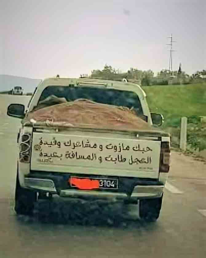 يكفيك أن ترفع عينيك خلف شاحنة، "تريبورتور"، أو حتى عربة يجرها بغل، لتقرأ حكايات موجزة، مفعمة بالألم والحكمة، الأمل والسخرية.